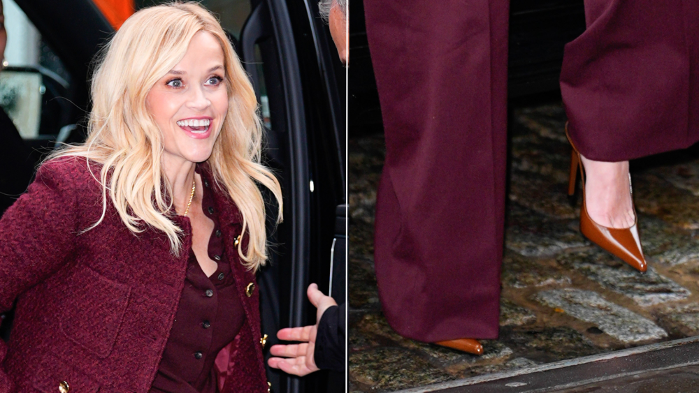 Witherspoon paired the pumps with a tonal outfit, layering a structured burgundy jacket over matching trousers and a simple top — keeping the same color palette from her weekend look.