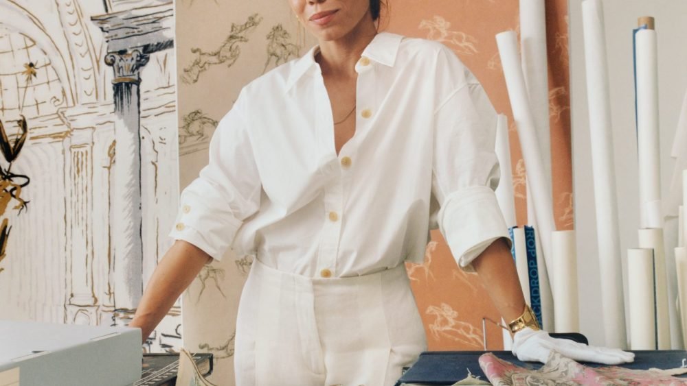 Nathalie Ebel poses in front of Palazzo Panel Set inspired by Schumacher archival designs.