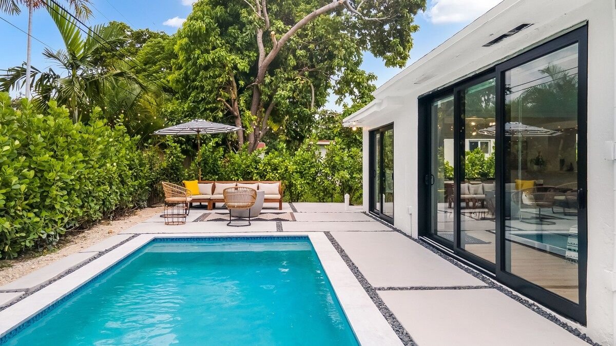 When you’re traveling with a crowd, this centrally located, sprawling compound makes a great home base: It sleeps nine people across two king beds and four double beds. Must-see destinations—including the Design District, Wynwood Walls, Coral Gables, the Pérez Art Museum, and downtown—are all within a 10-minute drive, and the beach itself is a mere five minutes away. The contemporary home has four bedrooms, and the spacious backyard has every amenity you can think of, including a heated saltwater swimming pool, firepit, lounge area, outdoor shower, pergola, and outdoor kitchen complete with a barbecue.