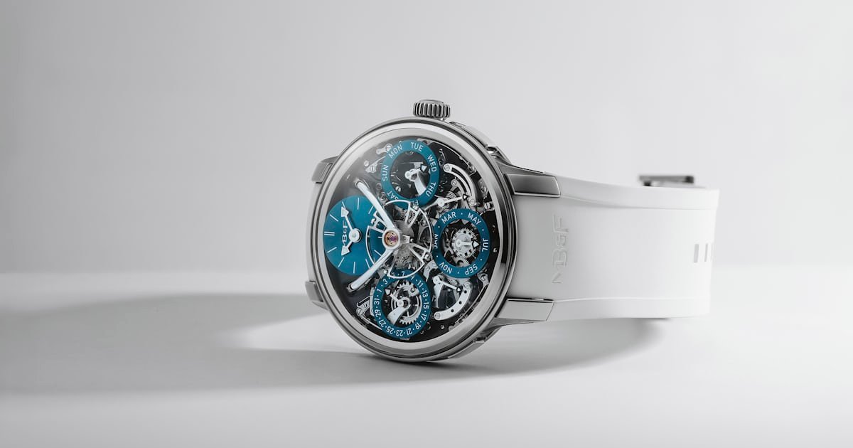 In doing so, the calendar doesn’t skip “redundant” days (as in most calendars), and therefore, there’s no possibility of the date jumping incorrectly. The date can be quick set with a pusher, and a safety prevents any risk of damage if the watch isn’t set correctly. The movement has 72 hours of power reserve and has MB&F’s signature flying balance beating at 18,000 bph.