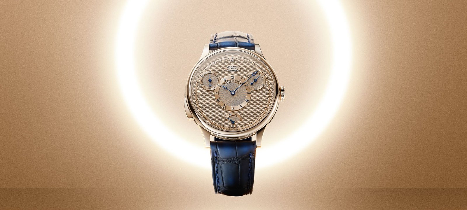 Design-wise, this watch shows inspiration from the No. 1176, a pocket watch offered from 1802 to 1809. Its 18K gold dial has a hand-guilloché “Quai de l’Horloge” pattern matching a similar motif on the case sides. This finishing contrasts against several circular-brushed sub-dial rings adorned with engraved and blued scales. The blue central hour hand aligns with the Roman-numeral-adorned ring, while the minute hand stretches far beyond it to the minute track enclosing all the sub-dials. A lower, arc-shaped display depicts the 60-hour power reserve. It becomes particularly interesting with the small displays on the upper right and left. Each shows running seconds, but the left register can be reset to zero using the pusher on the left flank.