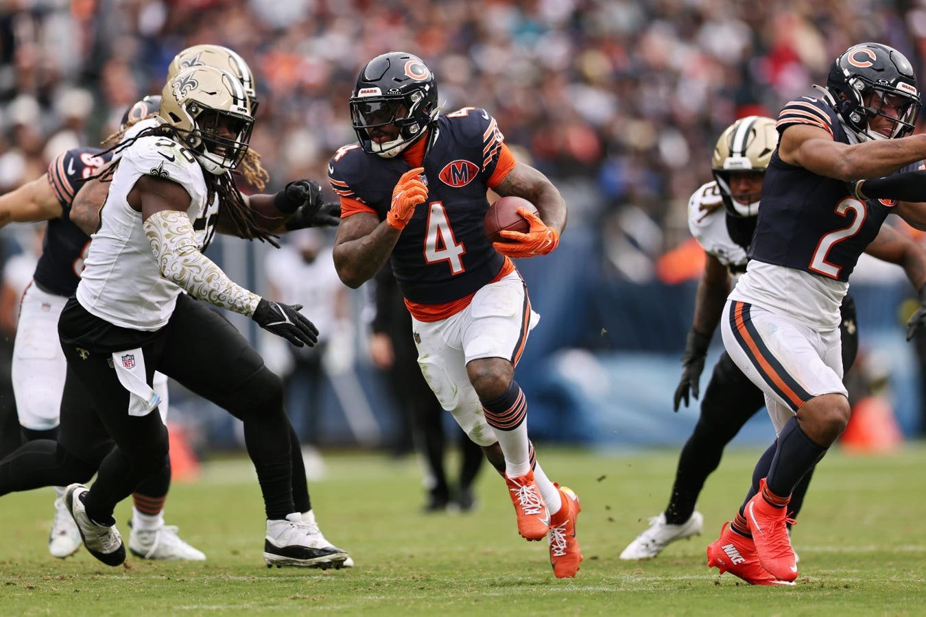 CHICAGO, ILLINOIS – OCTOBER 19: D’Andre Swift #4 of the Chicago Bears carries the ball against the New Orleans Saints during the second half of the game at Soldier Field on October 19, 2025 in Chicago, Illinois. (Photo by Geoff Stellfox/Getty Images)