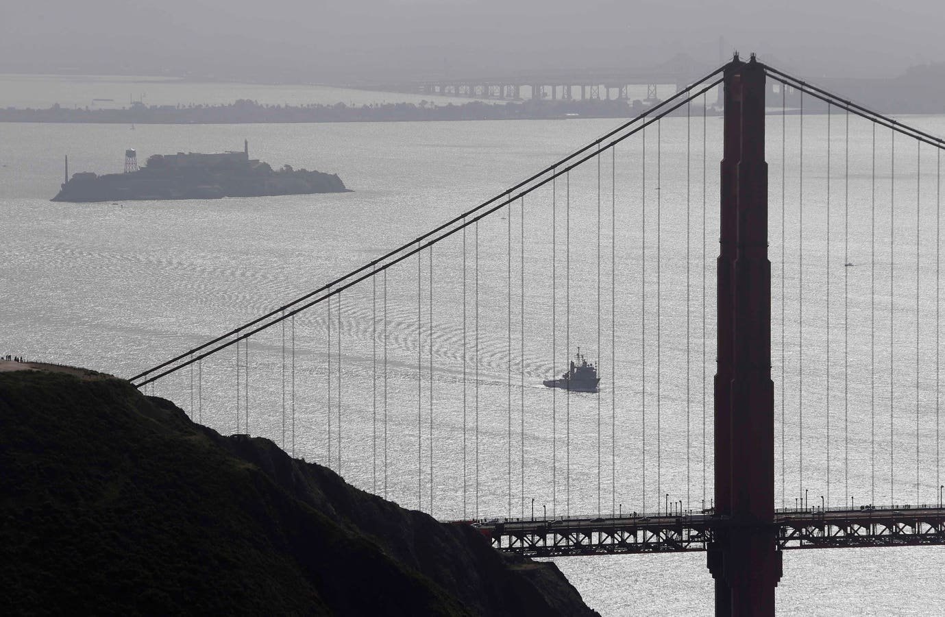 The previous USNS Navajo makes its way toward the Golden Gate Bridge with Alcatraz Island in the background Saturday, May 3, 2014. The next USNS Navajo will enter service in the coming months (AP Photo/Eric Risberg)