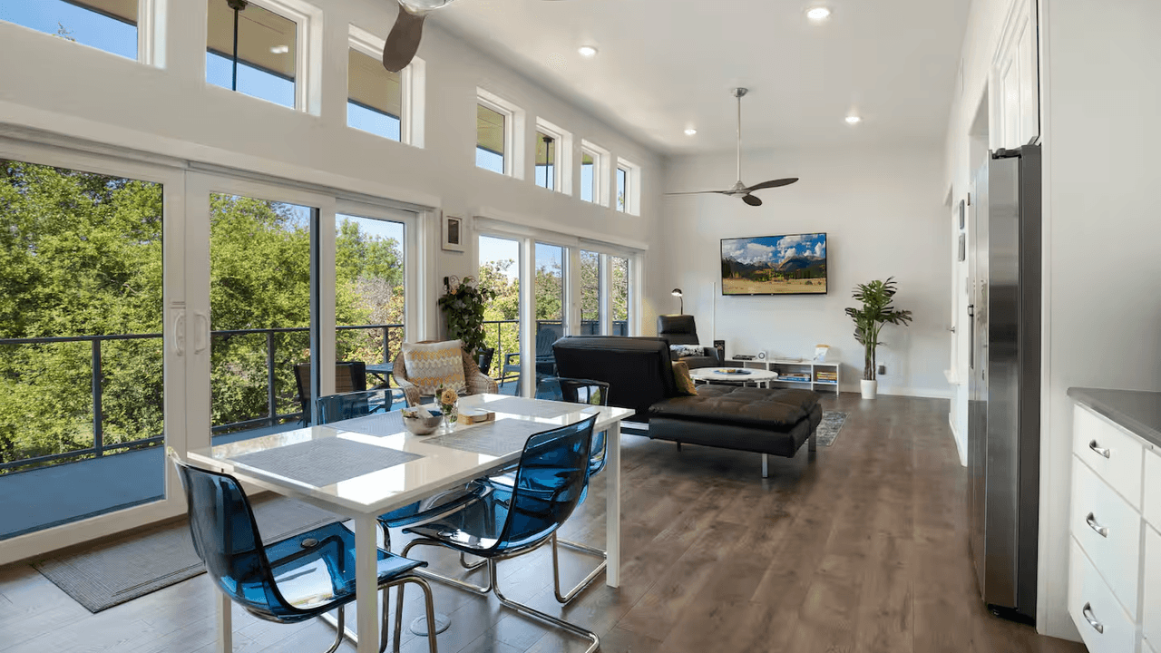 It’s rare to find vacation rentals in the sought-after Alamo Heights neighborhood, and this two-bedroom (one king, one queen, plus a sleeper sofa in the living room) offers the chance to truly live like a local. Post up on the front porch with your morning coffee, pick out a recipe from a selection of Tex-Mex cookbooks, or walk to one of the area’s staple restaurants, like Paloma Blanca or Tycoon Flats. A dedicated playroom and provided child gear—two crib options, a high chair, and a baby bath—make packing simpler for families, plus there’s a fenced-in backyard and a basketball hoop. This superhost even decorates for the holidays.