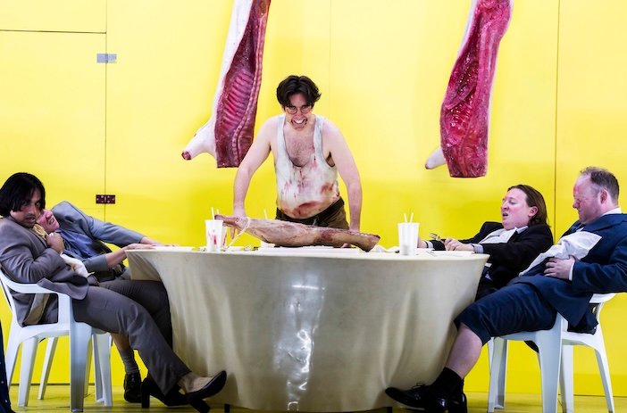 In some ways, the bare-ish stage, pared back to its industrial bones, is testament to the ENO’s ever-vanishing budget. In others, Jamie Manton’s production lays bare a surreal rawness that is at the very heart of the show from the butcher’s where Jack (a compelling Elgan Llyr Thomas) eats himself to death or the tap dancer who pirouettes his way across the terrified crowd as the incoming typhoon, the chorus down to their baggy white underpants queuing up for sex or the populace lying on sunloungers waiting for their “wellness wheesky”. We’re given as coruscating a diatribe against capitalism as Brecht could have dreamt of, its scenes tumble chaotically, led on by music that embraces every genre from the spoken word to jazz, from cabaret and ragtime to the operatic – quite an ask from the singers.