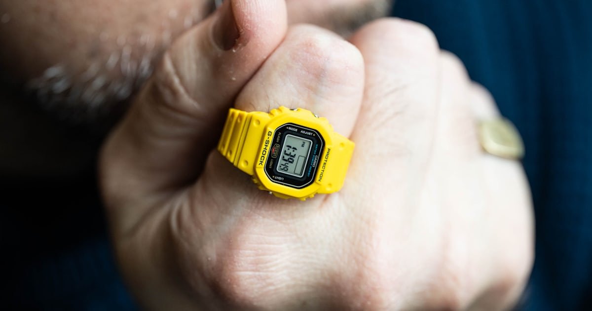 The exterior case of the DWN5600 is made of the same bio-based resin that most modern G-SHOCKs are made of today, with an internal core made of glass fiber-reinforced resin. This past launch offered three familiar colors: black, red, and yellow. Dimensions are, well, small. The case measures 20mm, with a lug-to-lug (or is it knuckle-to-knuckle?) of 23.4mm. Its height of 7.5mm means it’s surprisingly comfortable to wear on the finger, sticking out far less than I had initially imagined from photos.