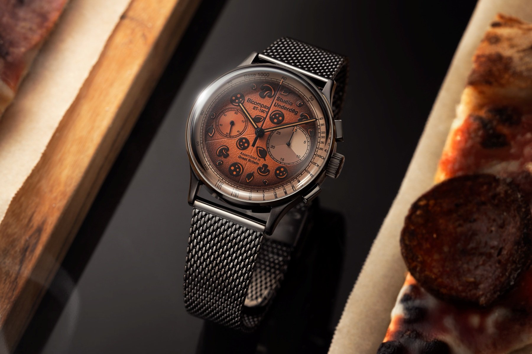 Goofy is what you expect from the founder of Studio Underd0g, Richard Benc. And if you know Andrew McUtchen of Time+Tide, you know he’s also in touch with his inner goofball. This resulted in the first pizza-themed watches, the Pepper0ni and Hawaiian. Now there’s a second and final serving, the Burnt Pepper0ni and Classic Cheese.