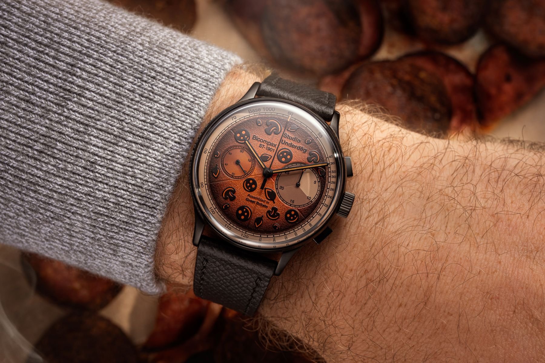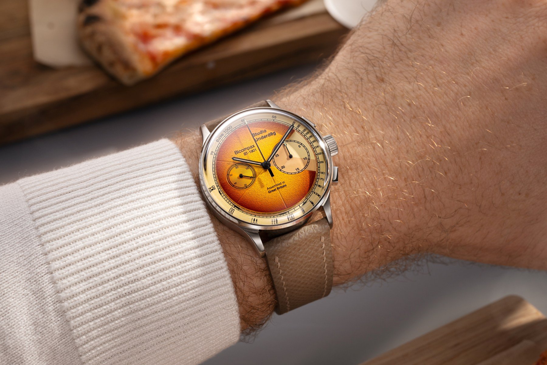 The two steel pizzas share a 38.5mm diameter and 13.6mm thickness. If you look at them proportionally, they might qualify as Chicago-style deep-dish pizzas, but I realize I’m treading on dangerous ground by saying that. In any case, the case shows a vintage-inspired, compact 44.5mm lug-to-lug measurement. Although affordable, the Studio Underd0g creations show great case finishing. The interplay of brushing and polished accents on the Classic Cheese (£625 / US$825 / AU$1,400) reflects careful attention to detail. Particularly noteworthy are the squared, polished pushers set against the horizontally brushed mid-case. The watch comes on an Epsom leather strap from The Strap Tailor.