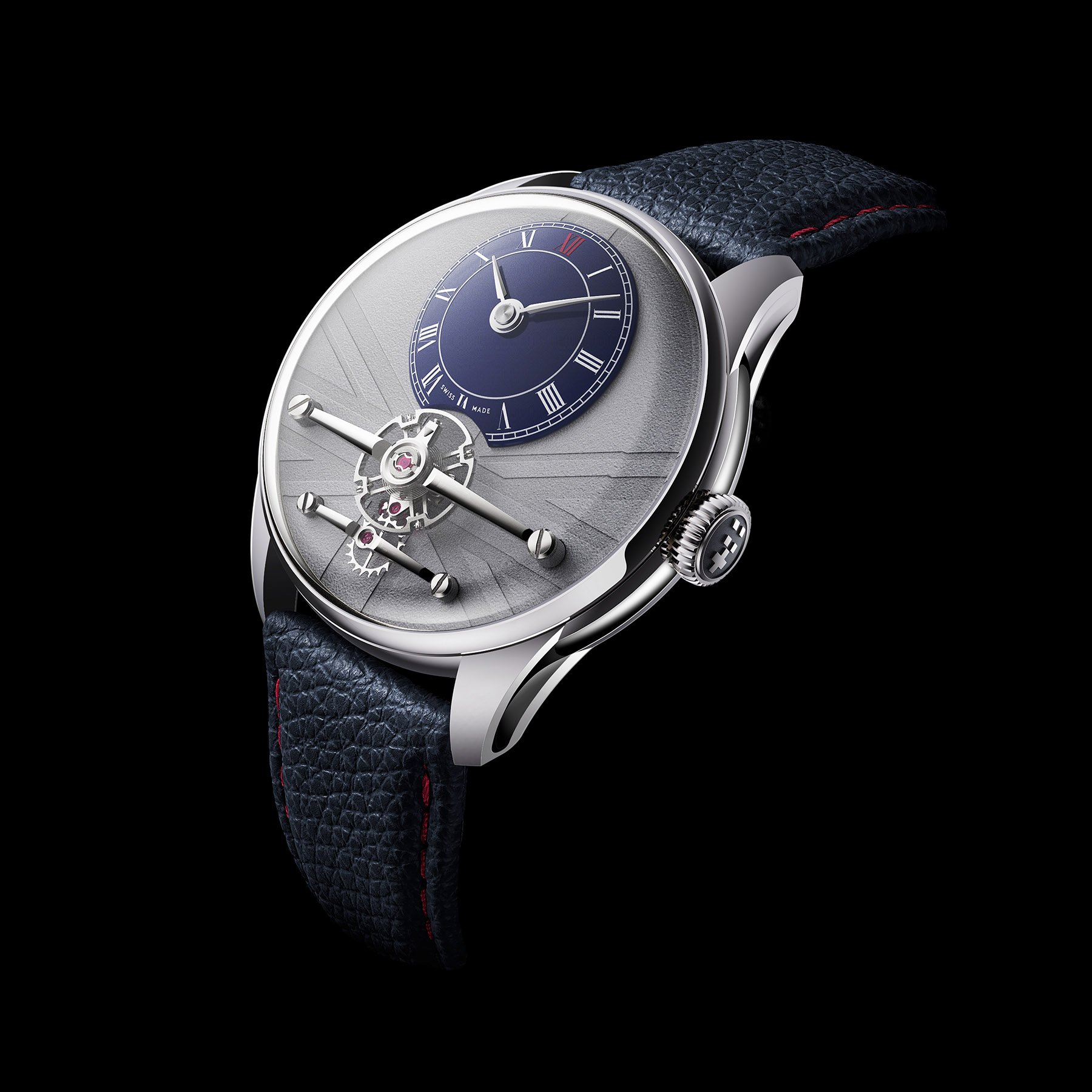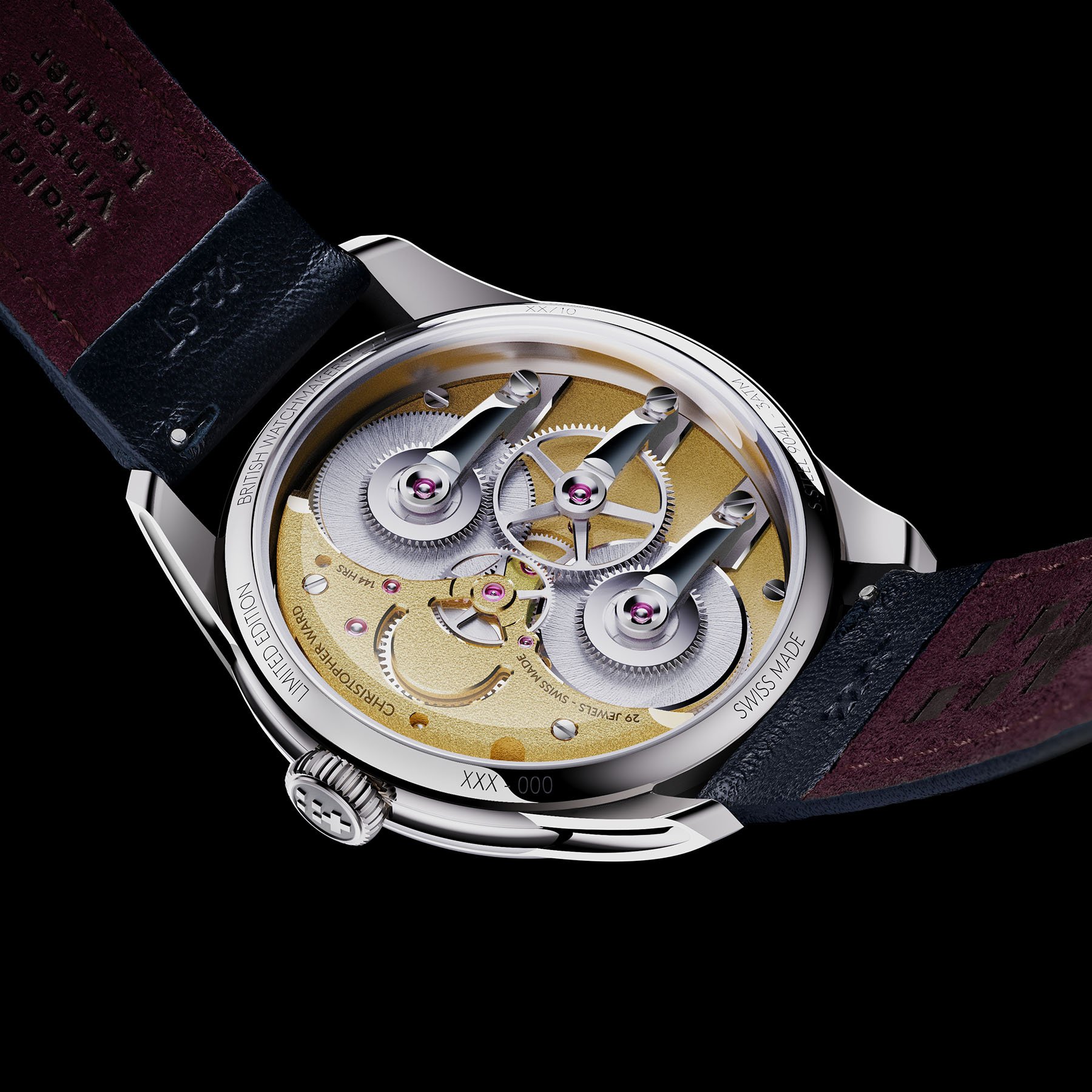 Christopher Ward is unveiling a 10-piece limited-edition C1 Loco that completely transforms the mechanical display. Breaking away from the angular twelve facets of the C12 Loco, the C1 Loco is far more traditional. With a smooth, round case, the free-sprung balance wheel takes center stage. The Union Jack motif emanates from its central pinion on a gray base, and a domed dial indicates the time with Roman numerals and patriotic colors.