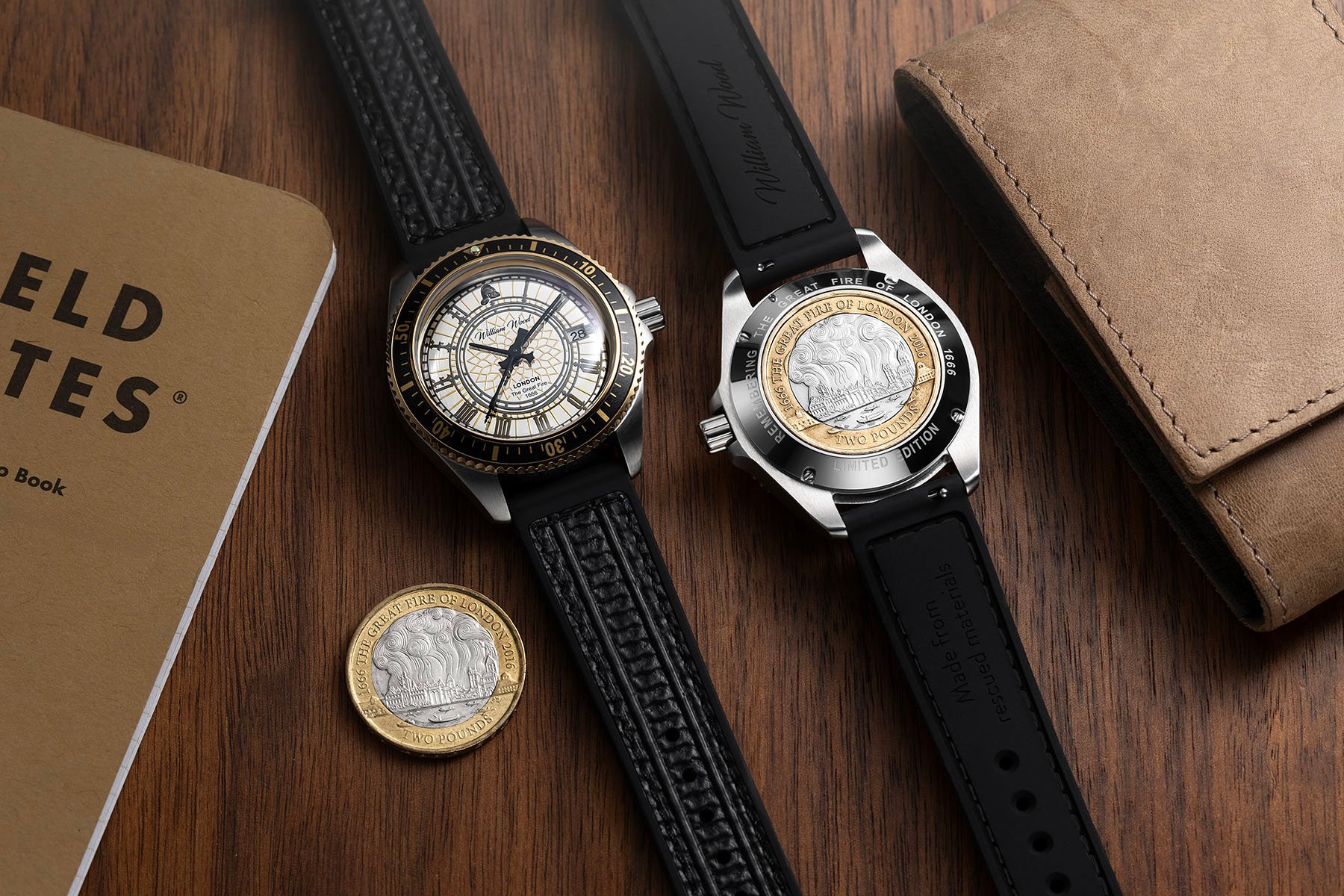 The dial resembles the iconic clock face on the Elizabeth Tower, which was built after another London fire in 1834. The 41mm 316L stainless steel case and unidirectional aluminum bezel have a brushed finish and gold-tone details. On the case back is a genuine £2 collector’s coin commemorating the 1666 fire. Beneath this case back is the Seiko NH35 automatic movement, a good workhorse for this commemorative timepiece. Available at the show for £995, this William Wood watch is limited to 50 pieces.