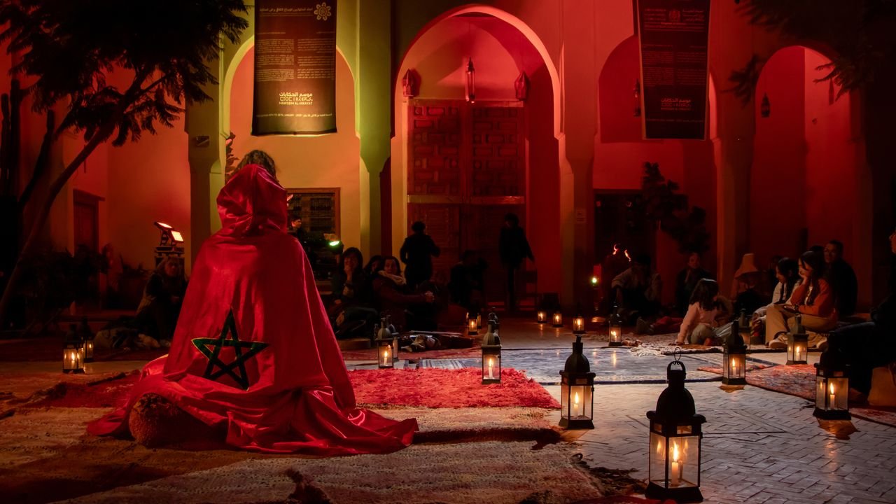 Marrakech’s week-long festival revives the tradition of sharing tales. Storytellers from across the world have been invited to participate in performances at Jemaa el-Fna square and Marrakech’s World Story Telling Café. A couple of days later, I find myself at the minimalist café. Hichem Derouich stands out against its beige walls with his red felt cap and patterned waistcoat, both of which become a colorful blur as he darts from place to place sharing his stories.