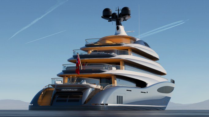 Turquoise tapped British studio H2 Yacht Design to bring the project to life. The new vessel will be home to five decks in all, with sculptural lines and panoramic views throughout. Those design features can be seen in action on the tiered exterior, including a beach club and plenty of spaces for eating and entertaining, such as a 16-person formal dining spot. Looking toward the bow, that area could become a helipad, and the vessel can house two Jet Skis, a waverunner, and two tenders.