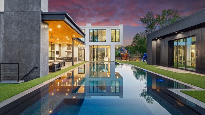 The dramatic estate features a contemporary mansion by Greg Perry Design with over 13,700 square feet of living space realized by the Thompson Building Group. Completed in 2023, it commands more than 1.75 acres of land behind two gated entrances with a subterranean garage and a poolside cabana. Valerie Mitchener of Corcoran HM Properties holds the listing for the six-bedroom and eight-bath spread.