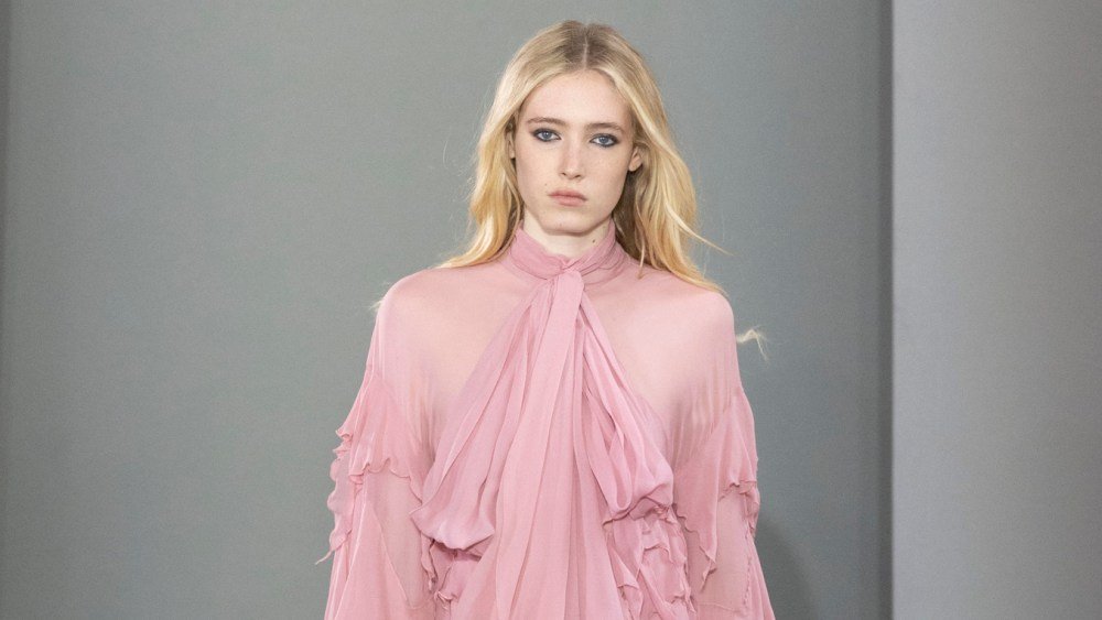 Sheer georgette frocks, tulle gowns, smocked minidresses, cascades of flounces and frills and lace inserts all contributed to the visual cacophony. Standing out in this were billowing blouses and dresses printed with butterfly motifs reworked to evoke leopard spots and, by contrast, sleek suiting in which the sharp lines of blazer jackets were softened on the back by georgette panels.