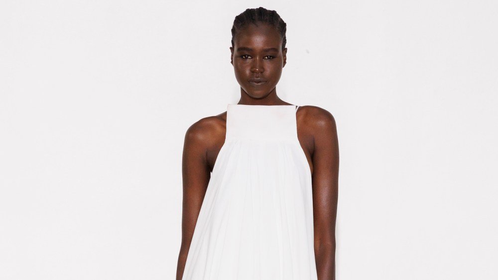 Numerous silhouettes were informed by the folds of closed umbrellas, a nod to the exhibition Traoré is preparing for the MUCEM in Marseilles next year. A jersey parachute dress was draped and held in place by ropes, worn with a lace veil in one look exploring bridal wear. The collection also saw a pair of brides walk down the aisle, linked by a shared black veil that looked to evoke an ancestral marriage ritual.