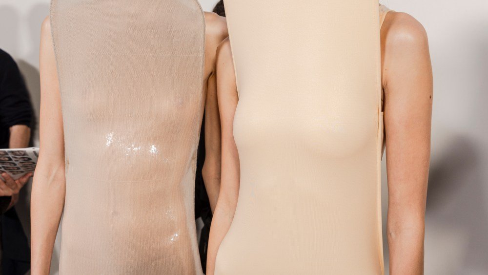 As the lighting cranked up, more people whipped out their shades. “Is it getting hotter in here?” wondered one guest. The models, meanwhile, shielded behind dresses with stiff front panels inspired by nylon car sunshades. “Even if they look quite stiff and quite couture, she can bend, she can sit,” Di Felice noted.