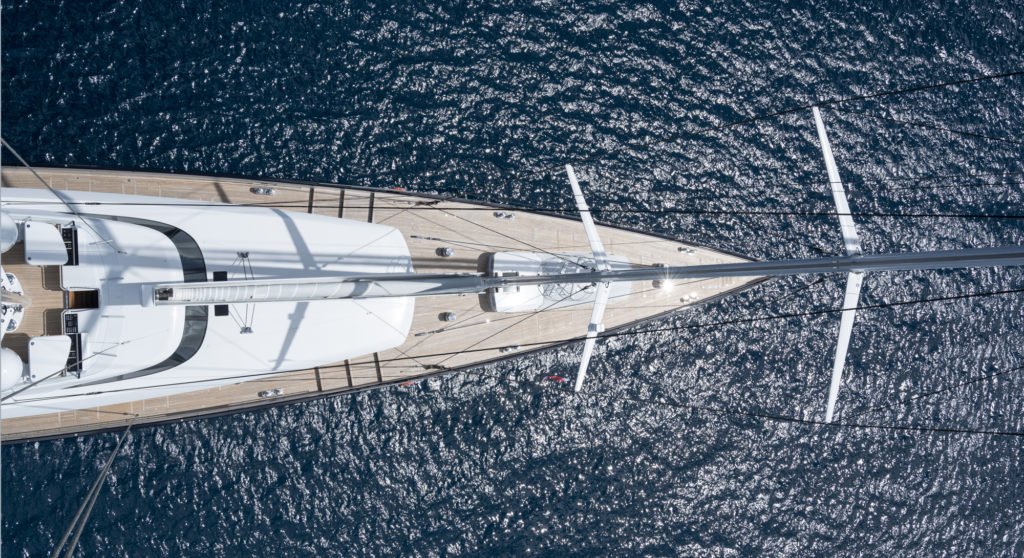 The Trident 810 series derives its name from the LOA, 81 meters (266 feet). As much as clients still receive a custom design, they save time by relying on a proven naval architecture platform. In fact, Royal Huisman says construction time is three years. Primary features of the platform are a long waterline, for instance, plus a Panamax rig (air draft is 202 feet /61.8 meters). The engineering is by Dykstra Naval Architects. The studio also created a sail-management system that makes quick work of hoisting the three mainsails simultaneously. According to Royal Huisman, it takes the same amount of time that it does on a yacht half her size. Given the 27,770-square-foot (2,580-square-meter) sail area, it’s impressive.
