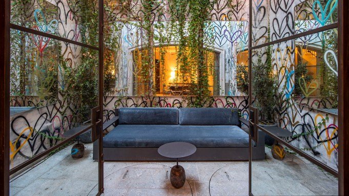Outside, stone terraces wrap around the house, with flower-lined pathways taking you from the pergola-covered dining area to the large swimming pool. The permaculturist Tommy Teeple designed edible gardens full of seasonal produce, fruit trees, and citrus groves—all ingredients you can cook up at the outdoor kitchen. From the basement level, you can access the “secret garden room,” wrapped in a mural by the artist James Goldcrown. The spray-painted hearts contain secret messages that the Noyeses designed for their grandchildren to find. Elsewhere, a greenhouse has been turned into a gym, and there’s a championship-size tennis court that’s also set up for pickleball, shuffleboard, and basketball.