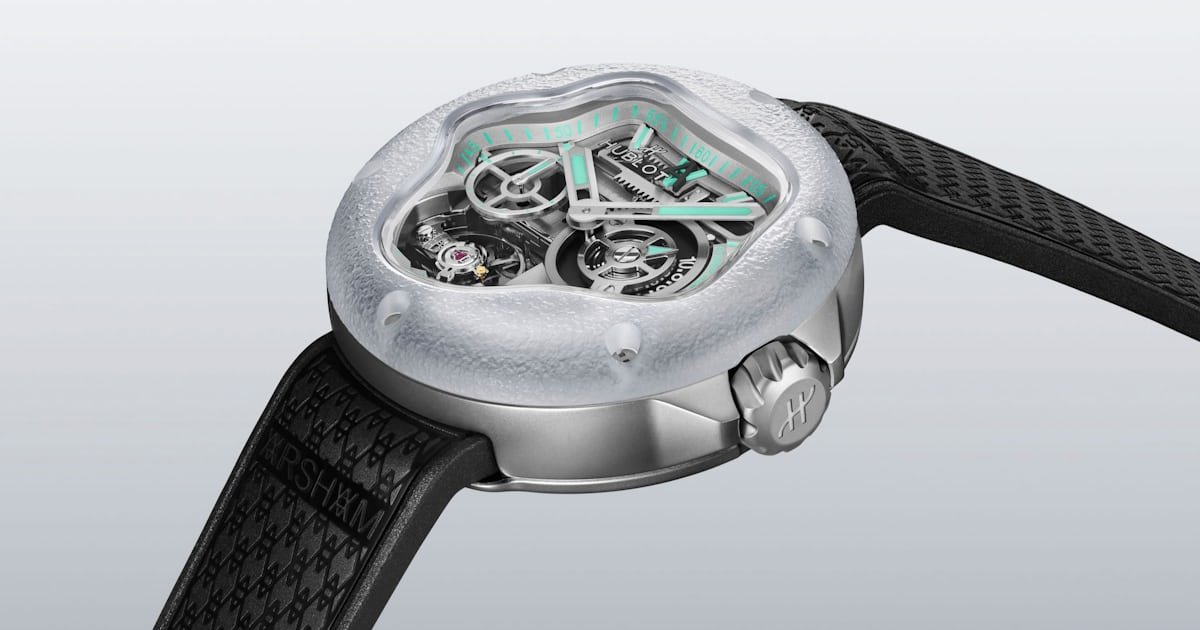 With design DNA taken directly from Arsham and Hublot’s first collaboration, the MP-16 Droplet pocket watch, the bezel is crafted out of laser-textured frosted sapphire and made in a fluid, splash-inspired form. Secured by the signature Hublot screws, it surrounds the rehaut that takes the same splashed form, framing the open-worked Meca-10 bridges for a very unique dial shape. With a small seconds sundial, the rack and pinion power reserve, and balance wheel in full view, the MP-17 ties it all together with Arsham’s iconic blue-green coloring on the accents and lume.