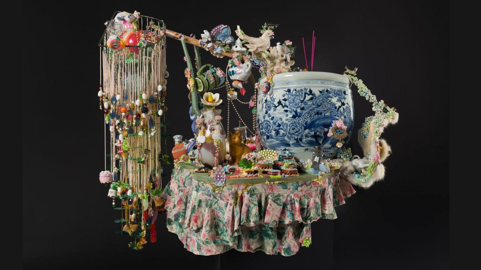 “I think it epitomizes the show in many ways,” Morris said. “There’s something very poignant about that work that speaks very directly to histories of family, histories of women in a lot of ways, histories of the ways that people in Chinese American cultures live with objects and collect objects and value things that relate to very valuable historical objects. There’s something about the way that Alison makes such a gorgeous mashup of all of those components that just strikes me as particularly poignant in relationship to that idea of everyday conversations, but also in the context of Chinese Americans, the sort of everyday rebellion of pushing that value of the more quotidian.”